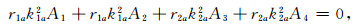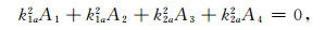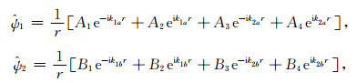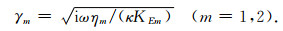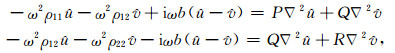 其中r是径向坐标, A1, A2, A3, A4, B1, B2, B3, B4是待定系数, k1a, k2a, k1b, k2b分别代表在外力作用下孔隙介质1、2中纵波的波数.波数可以通过如下频域内孔隙介质中的波动方程获得:
