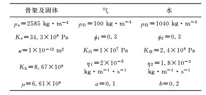其中ω表示频率, u、v分别表示孔隙介质中固相和流相的位移, i是虚数单位.质量系数ρ11、ρ12、ρ22, 弹性系数P、Q、R以及阻力系数b的求取可以参见相关文献[13, 15, 16].