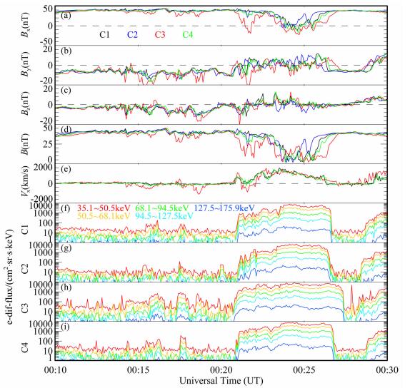 图 1 00:10~00:30 UT时间段内,Cluster卫星的观测数据 (a~d)依次代表磁场的三个分量及磁场强度,(e)表示x方向质子高速流,黑色、蓝色、红色和绿色曲线分别表示C1、C2、C3和C4卫星的数据;(f~i)分别表示四颗卫星的高能电子微分通量,不同颜色曲线代表不同的能量范围. Fig. 1 The data from the Cluster spacecraft between 00:10 and 00:30 UT (a~b) show three components and magnitude of magneticfield, (e) is x component of proton bulk flow velocity, the black, blue, red and green lines denote the data from C1, C2, C3 and C4, respectively.(f~i) indicate differential fluxes of energetic electrons. Different color lines denote the different energy. |