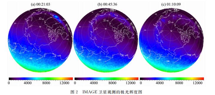 图 2 (a)00:21:03 UT;(b)00:45:36 UT;(c)01:10:09 UT. Fig. 2 Aurora images are obtained from IMAGE |