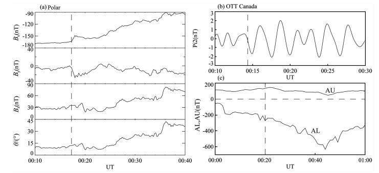图 3 (a) polar卫星观测的磁场数据三分量及磁仰角θ(Bz分量与x-y平面内磁场矢量的夹角);(b)加拿大OTT地磁观测台站Pi2脉动;(c)地磁AU和AL指数 Fig. 3 (a) Three components of magnetic field and them agnetic field elevation angle θ(the angle between Bz and the component of magnetic field in the x-y plane); (b) Pi2 pulse at the OTT observatory of Canada; (c) The indexes of AU and AL |