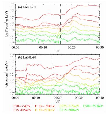 图 4 (a)和(b)分别代表LANL-01和LANL-97卫星观测的高能电子计数率,能量范围为50~750keV,不同的颜色曲线代表不同的能量范围 Fig. 4 (a) and (b) represent the count rate of energetic electros from LANL-01 and LANL-97 in energies from 50 to 750keV.Curves with different color denote the different energy range |