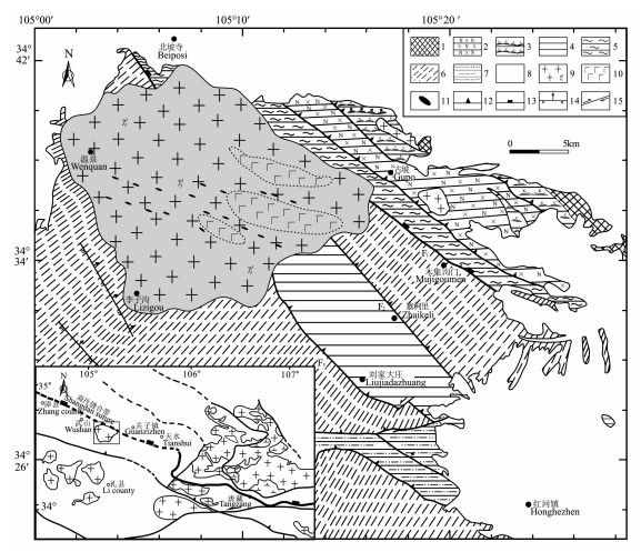 图 1 温泉岩体地质简图 1.秦岭岩群;2.关子镇蛇绿岩单位;3.流水沟片麻岩;4.太阳寺岩组;5.李子园群;6.泥盆系;7.石炭系;8.新生界;9.温泉印支期花岗岩;10.基性端元的岩石团块;11.暗色微粒包体;12.区域逆冲断裂;13.区域边界断裂;14.逆断层;15.平移断层 Fig. 1 Sketch geological map of the Wenquan pluton 1. Qinling group; 2. Guanzizhen ophiolite unit; 3. Liushuigou gneiss; 4. Taiyangsi group; 5. Liziyuan group; 6. Devonian; 7. Carboniferous; 8. Cenozoic; 9. Wenquan granite of Indo-Chinese epoch; 10. Block mass of basic end member; 11. Dark microgranular enclave; 12. Regional thrust fault; 13. Regional bordering fault; 14. Thrust fault; 15. Strike slip fault |