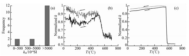 图 2 平均磁化率(km)分布直方图(a)和k-T曲线(b,c) (b,c)中,实线代表加热曲线,虚线代表冷却曲线.(b)代表顺磁性矿物为主要的磁化率载体;(c)代表磁铁矿为磁化率的载体. Fig. 2 Histograms of mean susceptibility (a) and k-T curves (b, c) In (b, c), block curve represents heating leg, and broken curve represents cooling leg. (b) shows that paramagnetic minerals are the main magnetic carriers of samples. (c) shows that magnetite is the dominant magnetic carrier of samples. |