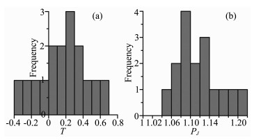 图 3 磁化率椭球体形状参数(T)(a)和校正磁化率各向异性度(PJ)(b)分布直方图 Fig. 3 Histogram of shape parameter (a) and corrected anisotropy degree (b) |