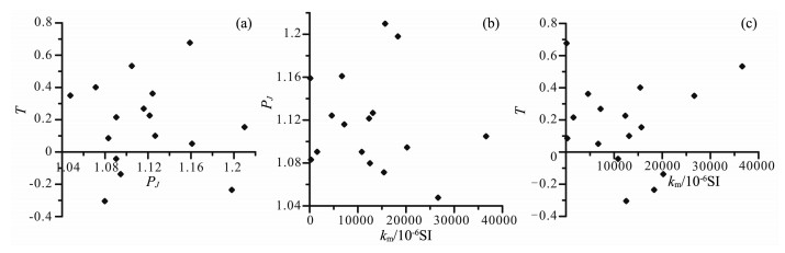 图 5 T-PJ(a), km-PJ(b), km-T(c)图解 Fig. 5 Diagram of T vs. PJ(a), km vs. PJ(b), km vs. T(c) |