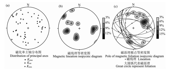 磁化率椭球体主轴方位与应变椭球体之间有良好的一致性,反映了岩石组构的优势产状,且具有一定的量值关系.温泉岩体磁化率椭球体主轴方向总体存在一定趋势,但部分点分布相对散乱(图 6).