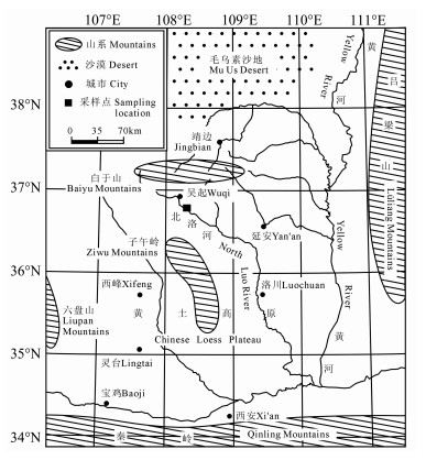 2 区域地质背景与样品采集吴起县位于黄土高原北缘,白于山南麓,北洛河上游.白于山海拔约为1200~1800m,主峰海拔1823m,大致呈东西走向,是北洛河等黄河支流的分水岭,同时也是毛乌素沙地与黄土高原的分界线(图 1).研究剖面位于吴起县土佛寺村白土沟(坐标:36°48′33.7″N,108°15′34.4″E).