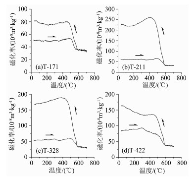 图 2 代表性样品的磁化率随温度变化(χ-T)曲线 (a)灰绿色泥质沉积物;(b)浅棕红色粉砂-泥质沉积物;(c)棕红色粘土质沉积物;(d)棕红色泥质沉积物.箭头方向表示加热或冷却过程. Fig. 2 Susceptibility versus temperature (χ-T) curve of representative samples (a) Greyish-green pelitic sediments; (b) Light red-brown silty-pelitic sediments; (c) Red-brown clayish sediments; (d) Red-brown pelitic sediments. Heating and cooling curves are indicated by the direction of arrows. |