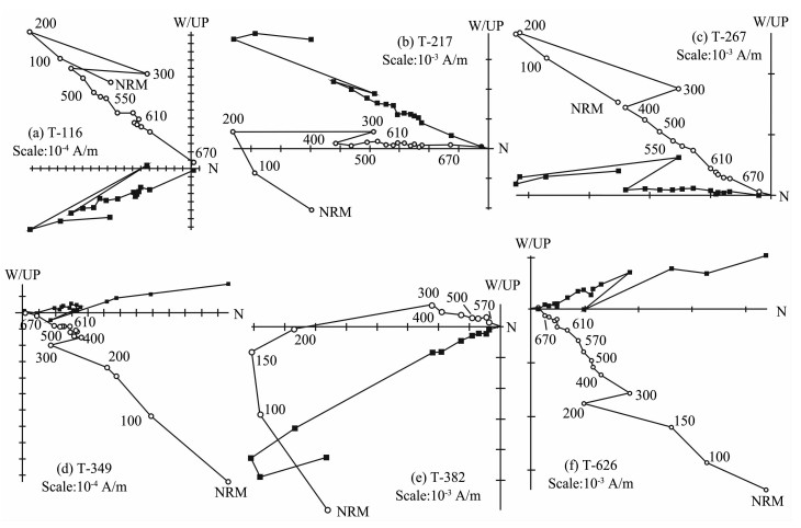 图 3 代表性样品的系统热退磁结果正交投影图 图中实心方块和空心圆圈分别表示水平面和垂直面的投影;数字表示温度(单位:℃);NRM表示天然剩余磁化强度(natural remanent magnetization).(a)灰绿色粉砂质泥岩;(b)棕红色泥岩;(c)棕红色粘土;(d)灰白色泥质粉砂岩;(e)棕红色泥质沉积物;(f)棕红色粘土. Fig. 3 Orthogonal projections of representative samples during thermal demagnetization The solid squares and hollow circles represent the projection on the horizontal and vertical plane respectively. The numbers refer to the temperatures in ℃.NRM stands for natural remnant magnetization. (a) Greyish-green silty mudstone; (b) Red-brown mudstone; (c) Red-brown clay; (d) Offwhite pelitic siltstone; (e) Red-brown pelitic sediments; (f) Red-brown clay |