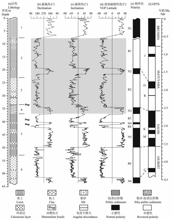 经过与国际地磁极性年表(GPTS,geomagnetic polarity time scale)[34]的对比,并结合已有资料与文献,认为顶部较长的正极性带N1属于Brunhes正极性时,由于存在不整合面,因此不能确定其具体时间.上部两个较长的负极性带R1和R2属于Matuyama负极性时,二者之间较短的正极性带N2对应于Olduvai亚时,缺失Reunion事件的记录;N3、N4和N5三个距离较近的正极性带属于Gauss正极性时,三者之间两个较短的负极性带R3、R4分别对应于Kaena和Mammoth亚时;最后一个较长的负极性带R5属于Gilbert负极性时,底部的正极性带N6对应于Cochiti亚时.