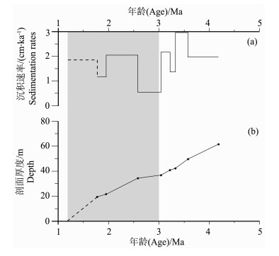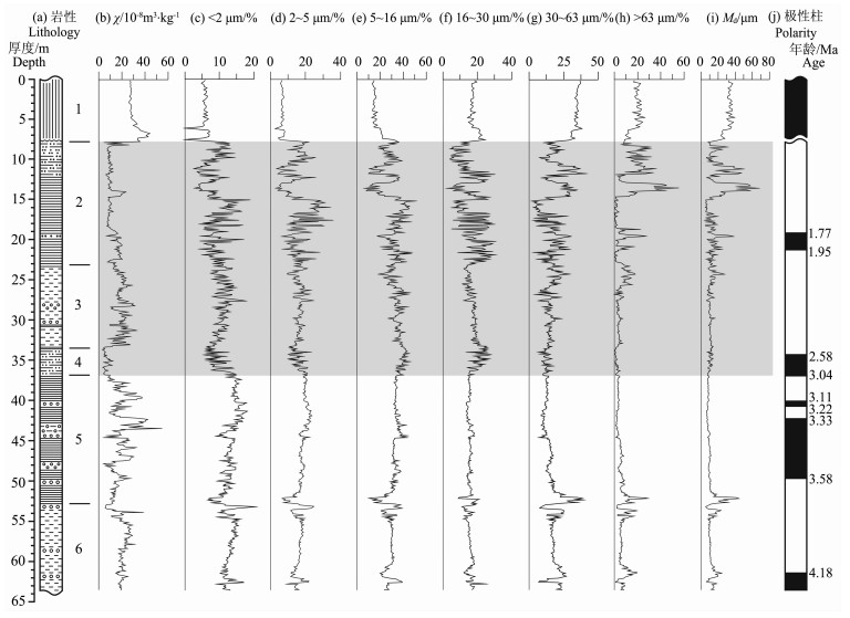 5 讨论土佛寺剖面的磁化率、粒度曲线(图 5)以及沉积速率(图 6)的变化能较好地与前文划分的岩性段对应.4.28~3.7Ma B.P.(前文中的第6层,63.5~52.7m)时为风成红粘土堆积,其磁化率和粒度各组分总体上变化都不大,沉积速率也较为稳定,保持在2cm/ka左右,与黄土高原其他地区的接近[36];只是在该阶段的末尾,即3.7Ma B.P.(54.7~52.7m)附近上述指标出现了较明显的波动.