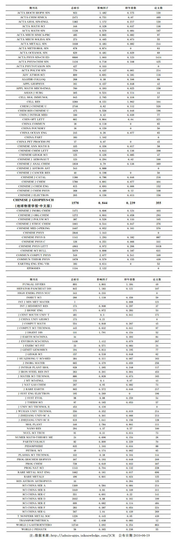 美国《科学引文索引(网络版)》(SCIE)2009年中国期刊计量指标. 地球物理学报, 2010, 53(6): 1502-1503,