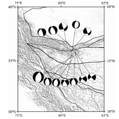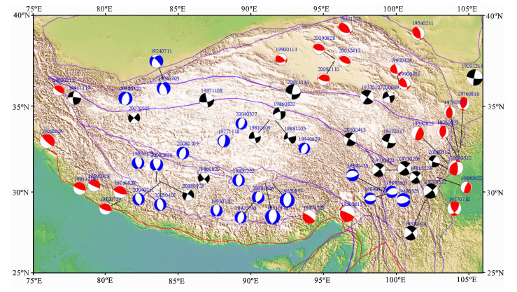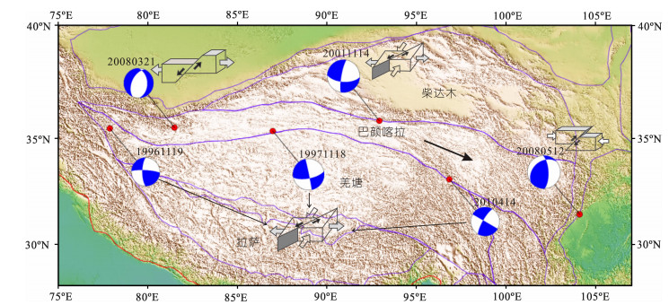取青藏地块1900年以来6级以上地震的矩张量解投影于图 4[10, 11].总体来看,逆冲类型地震都发生在青藏地块边界地带,如北部的柴达木和南部的喜玛拉雅块体,以及巴颜喀拉块体的东端.正断层发生在各个块体的内部(巴颜喀拉、羌塘、拉萨、川滇).走滑类型地震多数分布在块体的边界带上,如柴达木和巴颜喀拉块体之间、巴颜喀拉和羌塘块体之间、巴颜喀拉和川滇块体之间(鲜水河)
