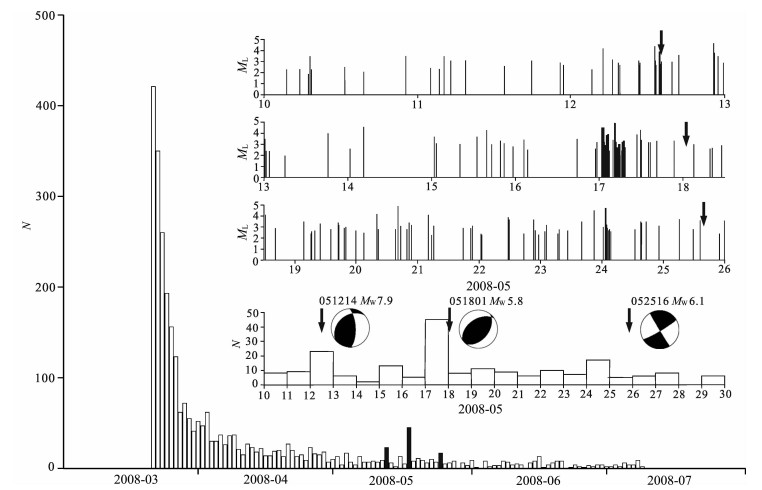 汶川地震发生时于田震区仍然有余震活动,根据新疆维吾尔族自治区地震局编制的于田序列目录,取ML2.0级以上地震做震级-时间分布和日频次图(图 2).图 2下方是于田序列地震日频次N,总体看衰减比较快,但在5月份有3次起伏(柱状图填黑);图 2上方将5月10日至30日的资料放大,黑色箭头标示汶川主震和强余震发生的时间,资料取自美国地质调查局(www.usgs.gov[2010-04]),震级Mw≥5.8,并附上哈佛大学CMT解.汶川地震当天余震比较多,为清楚起见只标注主震CMT解.从图中可以看出,5月12日14时28分汶川地震之前,于田序列的余震强度和频度有增高趋势,尤其在18日Mw5.8强余震前24h,于田震区的余震活动频度和强度在快速衰减的背景下出现显著增强.此外,25日的强余震之前重复出现类似现象,但不如前面两次起伏显著,时间间隔也比前两次稍长,可能与震源机制类型有关,前面两次震源机制类型为逆冲,25日地震震源机制类型为走滑.汶川主震和强余震发生前于田震区地震频度强度显著增强不是偶然的巧合,系内在的力学因素所致,表明巴颜喀拉块体存在整体的向东运动,并且是西部显示在先,东部响应在后,可以从2个地震序列中体现出来.