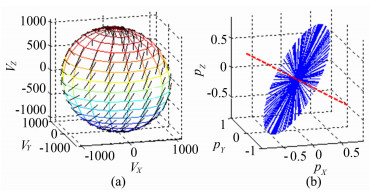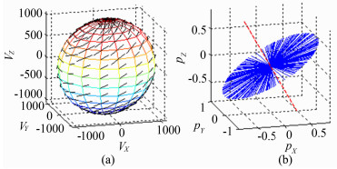对于TTI介质SH波偏振方向,用一组不同对称轴倾角的TTI介质来研究,图 9至图 11为不同对称轴倾角的TTI介质,它们的各向异性参数γ均为0.2,对称轴倾角分别为0°、30°、60°.图(a)表示相速度和偏振向量,其中曲面为等相速度面,短线表示偏振方向;图(b)表示偏振方向,其中实线是偏振方向,虚线是TTI介质对称轴方向.图中表明,不论TTI对称轴倾角取何值,TTI介质SH波偏振方向始终垂直于等相速度面,并且它本身所有的偏振方向均在垂直于对称轴的同一个平面内.