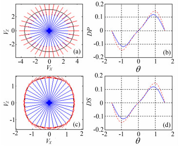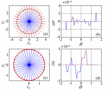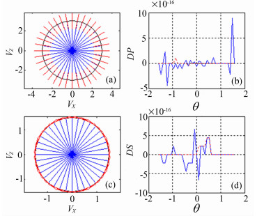图 12 各向同性介质偏振(ε=0.0, δ=0.0, θ0=0°) (a)和(c)分别表示qP波和qSV波传播方向和偏振方向, 黑线分别为qP波和qSV波相速度, 蓝线为传播方向, 红线为偏振方向;(b)和(d)分别为qP波和qSV波偏振方向与传播方向的差与传播方向的关系, 即DP=φP-θ, DS=φS-θ-π/2, 单位均为rad, 实线为精确偏振方向与传播方向的差, 虚线为弱各向异性近似偏振方向与传播方向的差.图 13~图 17与此相同. Fig. 12 Polarization in isotropic media (ε=0.0, δ=0.0, θ0=0°) (a) is propagation direction and polarization direction of qP wave, (c) is propagation direction and polarization direction of qSV wave, the black line is phase velocity, the blue line is propagation direction, the red line is polarization direction; (b) represents the relationship between DP and propagation angle θ for qP wave, the DP=φP-θ is the difference between polarization angle φP and propagation angle θ (units are all radian); (d) represents the relationship between DS and propagation angle θ for qSV wave, the DS=φS-θ-π/2 is the diference between polarization angle φS and propagation angle θ then subtract π/2, the solid line s about exact polarization, the dashed line is about approximate polarization.Same asFig. 13~Fig. 17. |