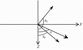 再考虑XOZ面内二维情况qP波和qSV波的偏振方向.令qP波的偏振方向与Z轴夹角为φP,qSV波偏振方向与Z轴夹角为φS,qP波的偏振方向为(sinφP,cosφP),qSV波偏振方向为(sinφS,cosφS),如图 2所示.