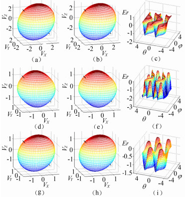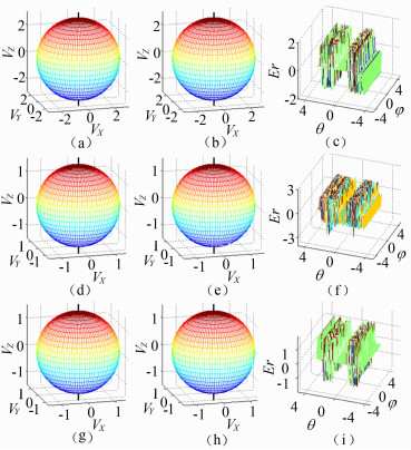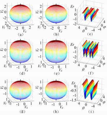 图 3 各向同性介质精确和近似相速度(103m/s)及相对误差(10-16)(ε=0.0, δ=0.0, γ=0.0, θ0=0°) (a)为qP波精确相速度,(b)为qP波近似相速度,(c)为qP波近似相速度相对误差,(d)为qSV波精确相速度,(e)为qSV波近似相速度,(f)为qSV波近似相速度相对误差,(g)为qSH波精确相速度,(h)为qSH波近似相速度,(i)为qSH波近似相速度相对误差.图 4~图 8与此相同. Fig. 3 Exact and approximate phase velocity (103m/s) and relative error (10-16) of them in isotropic media (ε=0.0, δ=0.0, γ=0.0, θ0=0°) (a) Exact phase velocity of qP wave, (b) Approximate phase velocity of qP wave, (c) Relative error of qP wave, (d) Exact phase velocity of qSV wave, (e) Approximate phase velocity of qSV wave, (f) Relative error of qSV wave, (g) Exact phase velocity of qSH wave, (h) Approximate phase velocity of qSH wave, (i) Relative error of qSH wave.Same asFig. 4~Fig. 8. |