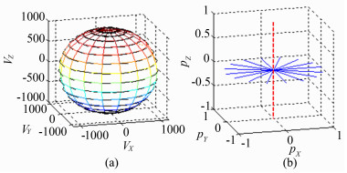 图 9 TTI介质SH波偏振方向(θ0=0°) (a)表示相速度和偏振向量, 其中曲面为等相速度面, 短线表示偏振方向;b)表示偏振方向, 其中实线是偏振方向, 虚线是TTI介质对称轴方向.图 10、图 11与此相同. Fig. 9 Polarization direction of SH wave in TTI media (θ0=0°) (a) Phase velocity and polarization vector, where the surface is equal phase velocity surface, the short line is polarization vector. (b) Polarization direction, where the solid line is polarization direction, the dashed line is direction of symmetry axis of TTI media. Same as Fig. 10~Fig. 11. |