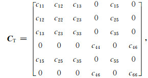 假设TTI介质对称轴位于观测坐标系XOZ面内,并且与观测坐标系Z轴的夹角为θ0.再假设本构坐标系下垂直横向各向同性(VTI)介质独立的弹性参数为c110,c330,c440,c660,c130.根据Bond变换和VTI介质的刚度矩阵,可得TTI介质刚度矩阵为CT,即