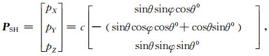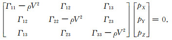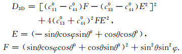 3 TTI介质弹性波精确相速度本文没有采用坐标旋转的方法[11, 12],而是在观测坐标系直接求取TTI介质弹性波相速度和偏振方向.根据一般各向异性介质Christoffel方程,结合TTI介质的弹性矩阵CT,令P=(pX,pY,pZ)T为偏振方向,n=(sinθcosφ,sinθsinφ,cosθ)T为传播方向,θ为传播方向与Z轴的夹角,φ为传播方向的方位角,可得到TTI介质Christoffel方程: