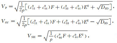 为使TTI介质Christoffel方程有非零解,必须使其系数矩阵行列式为零.求解该方程,得到了TTI介质中qP波、qSV波和qSH波相速度的解析表达式[14]: