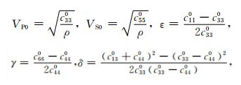其中VP0、VS0分别为qP波和qS波垂直TI介质各向同性面的相速度;ε、δ和γ是表示TI介质各向异性强度的三个无量纲因子:ε是度量qP波各向异性强度参数,δ是影响垂直TI介质对称轴方向附近的qP波速度大小的参数;γ是度量qS波各向异性强度或横波分裂强度的参数.
