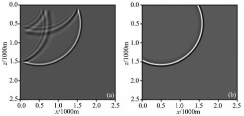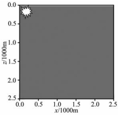 为了说明伪谱法的边界问题,首先给出了一个v=2500m/s常速模型(图 1),震源设在x=500m,z=500m的位置处.由于伪谱法分别在x,z方向进行傅里叶变换(以二维为例),所以致使震源周期性地在左、右和上、下出现虚震源(图 2a中白色震源所示).导致的结果就是周期性地由虚震源传回假波场(或称为伪波场).从记录t=0.5s时刻波场快照(图 2b)可明显看见首先从右侧、底部及右下角点处由虚震源传播回来的伪波场.随着记录时间的增长将会从上部、左侧及其他三个角点传播回伪波场,这就造成了有效波和来自不同方向周期性的伪波场发生混叠.所以对于伪谱法必须处理好边界问题,否则有效波场会受到严重干扰.为了消除这种周期性问题,本文采用了Furumura的反周期扩展法.该方法的基本思想就是在按照一定时间步长递推过程中,把虚震源产生的周期性假波场剔除出去.具体实施过程为:第一步由长度为N的f(nΔx)的函数,计算出含有周期性波场的pper;第二步是扩展f(nΔx)为2N长度的新函数,计算出反周期波场panti;第三步在pper中减去panti就得到了最终的有效波场.这个过程可类似地应用于消除来自不同方向的伪波场.虽然这种方法在一定程度上增加了计算量,但该方法不需要扩边处理,而且对于消除伪谱法所带来的周期性波场的效果是比较好的.