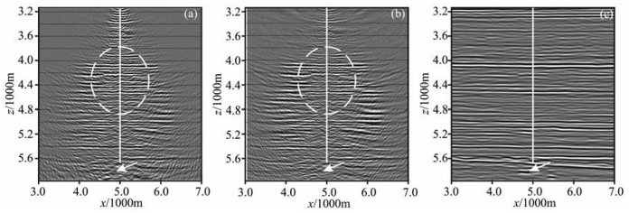 最后对某地区VSP野外采集的数据进行了逆时偏移成像.该工区成像目的层是埋藏深度在4000~5800m的井周围岩溶体系和底砾岩.根据该区地面地震偏移剖面,可发现在深度5600 m左右有明显的溶洞响应(图 10中白色箭头所示),并经过该区钻井资料证实了溶洞的存在.本文选取该工区3D VSP过井炮线进行了逆时偏移成像(图 10a)及深度域Kirchhoff VSP偏移成像(图 10b).井位于x=5000m处,炮间距为100m,共有98炮在井两旁对称分布;采用间距为20m的32个检波器接收,下放深度从3000~3620m.并与地面地震3D Kirchhoff法叠前时间偏移结果(图 10c)进行了比较,两种方法采用相同的速度模型和输入资料,VSP Kirchhoff法偏移孔径为5000m.可见三者主要层位对应性比较好,在偏移剖面中都存在明显的溶洞特征.从图 10中不难看出,VSP偏移成像分辨率高于地面地震的,而且逆时偏移在近井区成像连续性上明显优于基于高频射线理论的Kirchhoff法VSP偏移结果.验证了VSP逆时偏移在成像上具有一定的优势.