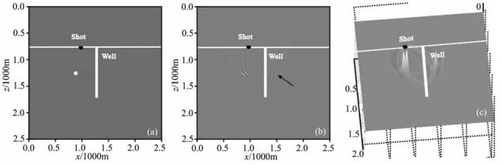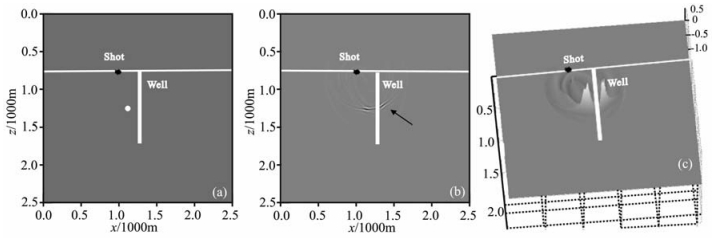 图 6 (a)远井绕射点模型示意图;(b)单炮VSP逆时偏移结果;(c)振幅大小对比图 Fig. 6 (a) The model of a diffraction point far away from well; (b) A single shot VSP RTM image; (c) Migrated amplitude map |
