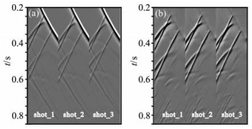 图 7 (a)地堑模型中抽取的三炮VSP记录;(b)为分离出来的上行波场 Fig. 7 (a) Three VSP shot records; (b) The separated upgoing wavefield of (a) |