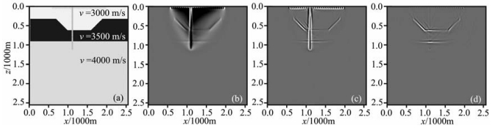 图 8 (a)地堑速度模型;(b) VSP全波场逆时偏移结果;(c)为图 8b经过Lapktrn滤波后结果;(d)分离出的上行VSP波场逆时偏移结果 Fig. 8 (a) Velocity of graben model; (b) RTM image using the full wavefield; (c) The image with Laplacian filter applied to (b); (d) The RTM image using the separated upgoing wavefield only |