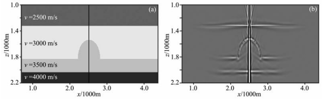 图 9 (a)半球隆起速度模型;(b) VSP全波场逆时偏移结果 Fig. 9 (a) Velocity model; (b) RTM image using full wavefield |