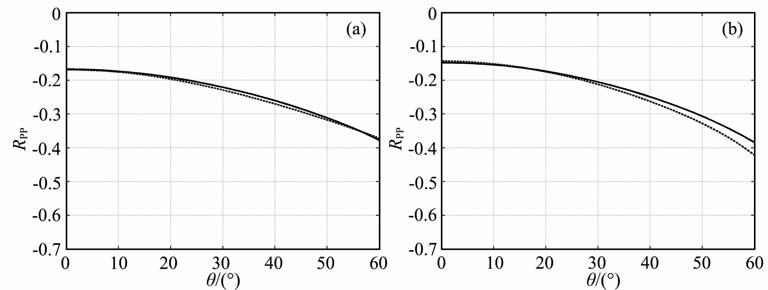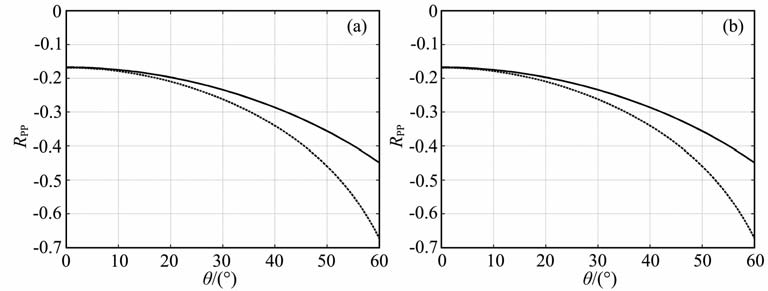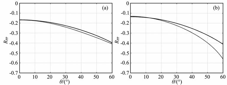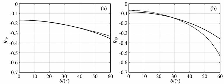 图 4 椭圆各向异性介质(a)(ε=0.2,δ=0.2,θ0=0°)和TTI介质(b)(ε=0.2,δ=0.2,θ0=30°)的精确(实线)和近似(虚线)PP反射系数RPP Fig. 4 Exact (solid line) and approximated (dashed line) of PP reflection coefficient Rpp in elliptical media(a) (ε=0.2,δ=0.2,θ0=0°) andTTImedia (b) (ε=0.2,δ=0.2,θ0=30°) |