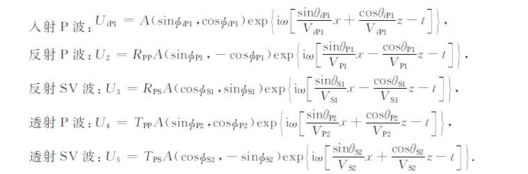 其中ω 是角频率,t是时间,x和z是位置坐标.V,θ,Φ 分别表示波的相速度、传播角和偏振角[27],下标i表示入射波,P和SV 分别表示qP 波和qSV 波,1和2分别表示TTI介质1和2.RPP,RPS,TPP和TPS分别表示PP反射系数,PS反射系数,PP 透射系数和PS透射系数.