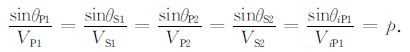 根据惠更斯原理可以证明,反射qP 波的传播角θP1、反射qSV 波的传播角θS1、透射qP 波的传播角θP2、透射qSV 波的传播角θS2、入射qP 波的传播角θiP1满足斯奈尔(Snell)定律: