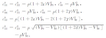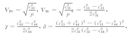 其中,VP0、VS0 分别为qP波和qS波垂直TI介质各向同性面的相速度;ε,δ 和γ 是表示TI介质各向异性强度的三个无量纲因子:ε是度量qP波各向异性强度参数,δ 是影响垂直TI介质对称轴方向附近的 qP波速度变化的参数;γ 是度量qS波各向异性强度或横波分裂强度的参数.Thomsen 表征的TI介质参数使得各向异性介质的弹性参数物理意义更加明显.上述的Thomsen参数是用弹性参数表示的,而弹性参数也可以用Thomsen 参数表征.VTI介质弹性参数的Thomsen参数表征如下:
