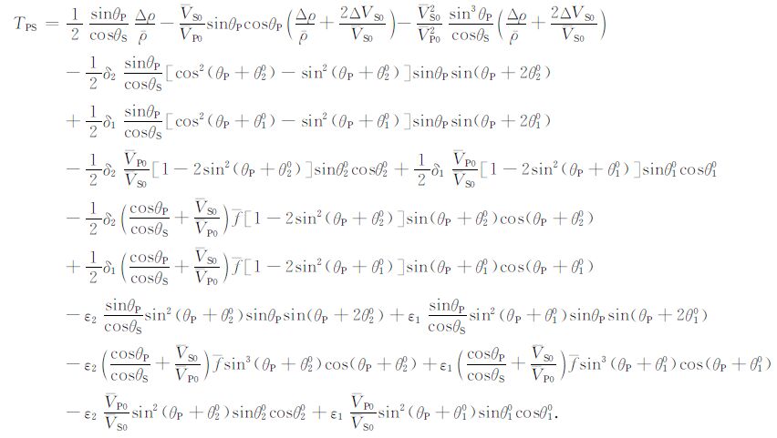 反射系数和透射系数RPP,RPS,TPP,TPS 的近似表达式请见附录.反射系数和透射系数的近似表达式十分简洁,他们都是参数ΔVP0/VP0,ΔVS0/VS0,Δρ/ρ 以及各向异性参数ε1,ε2,δ1,δ2 的线性函数,也是关于入射相角θP 和对称轴倾角θ10、θ20 的复杂函数.