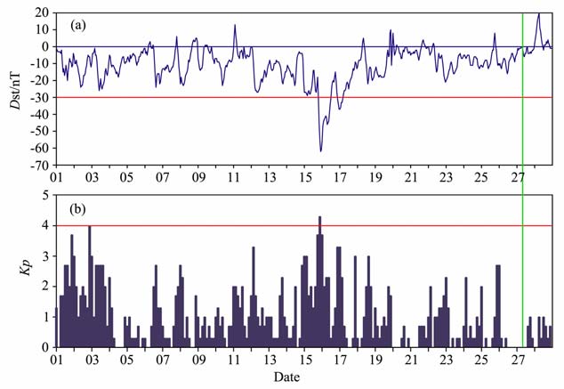 2 数据选取本研究选取数据为20°S~50°S,260°E~300°E范围内的升轨数据,这样,卫星经过震中上空为世界时1~4 时,即当地时21~24 时.根据地磁指数(Dst、Kp,参见图 1),2010年2月15~17日有一弱磁暴发生(最小Dst指数为-62nT).为了避免该磁暴的影响,我们主要分析2 月18~27 日震前10天及2月28日震后1天的数据资料.这些资料为升轨数据(夜侧),每天包含2轨,经向上相差约24°,本段时间内共22轨数据.