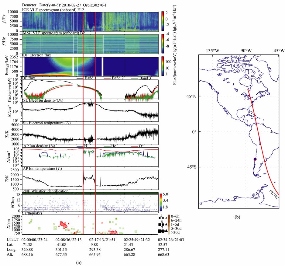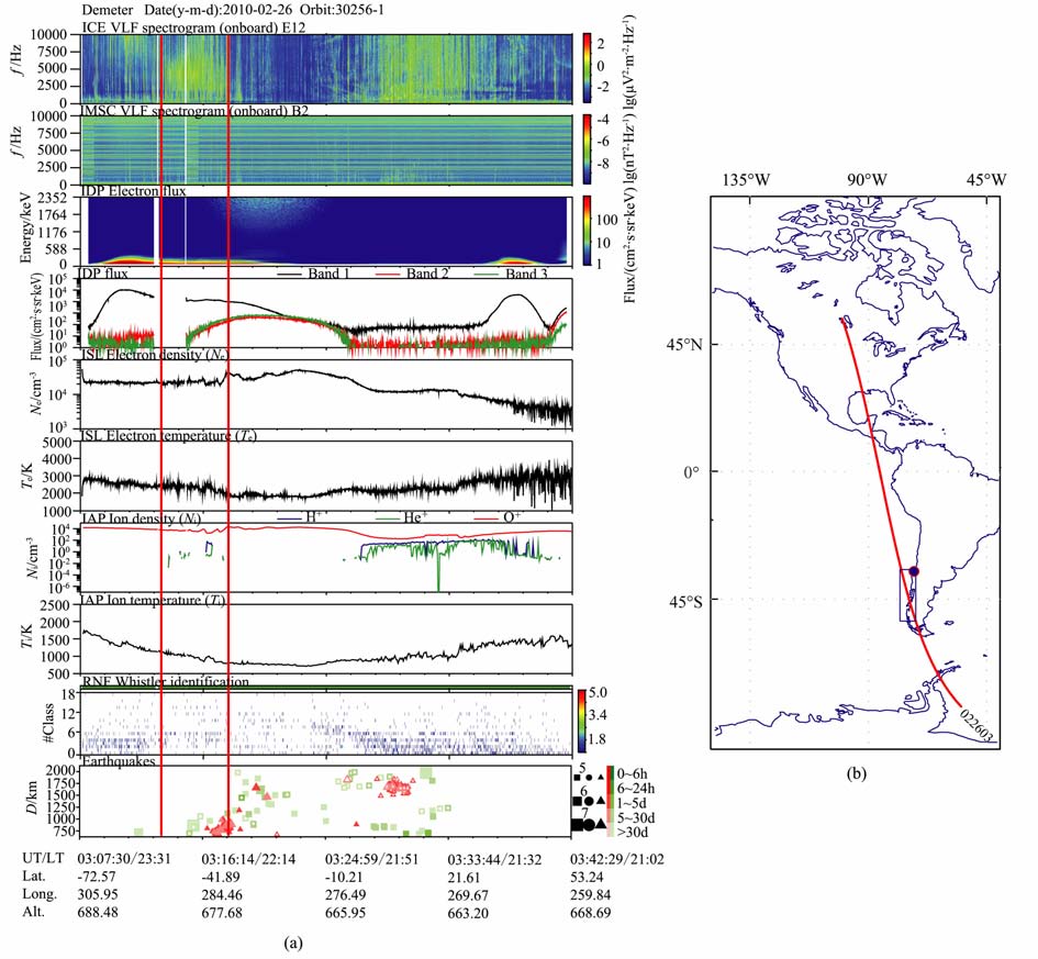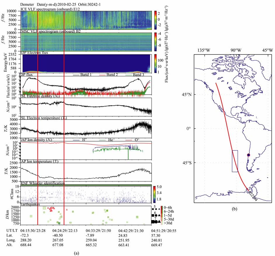 如图 2a 所示的是其中一轨(2 月25 日升轨30242)数据示例,从上至下各参量分布为:电场频谱、磁场频谱、高能粒子能谱、高能粒子通量、电子浓度、电子温度、三种离子(H+ 、He+ 、O+)的浓度、离子温度、人工神经网络所记录的哨声数.上述DEMETER 网站同时还在2 级图像的最后一行给出了地震事件,此图纵坐标即代表震中到卫星的距离,三角形代表相对此幅图时间之后的地震,方框代表之前的地震,圆形代表同震,用图形大小代表不同震级的地震,而不同的颜色等级对应从大于30天到0~ 6小时的时间范围,颜色越深,说明离地震时间越短.图 2b给出了此幅2级图像对应的卫星轨道.