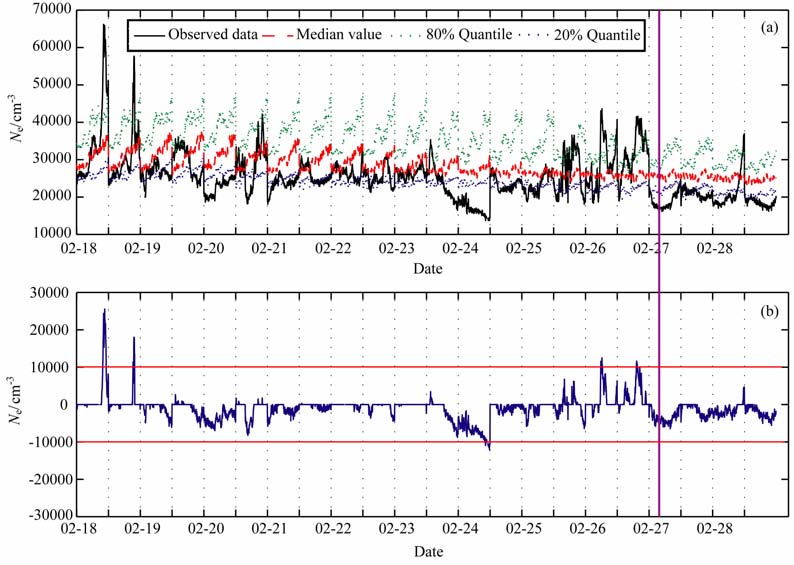 图 5 电子浓度(Ne)滑动中值时间序列图 (a)为原始观测值及其上下阀值,(b)为观测值减上下阀值.紫色线为发震时刻. Fig. 5 Time series chart of electron densities with gliding median method (Original observations, upper and lower thresholds are shown in figure (a) ; Values subtracted upper and lower thresholds are shown in figure (b) ; Earthquake time is marked by purple line. |