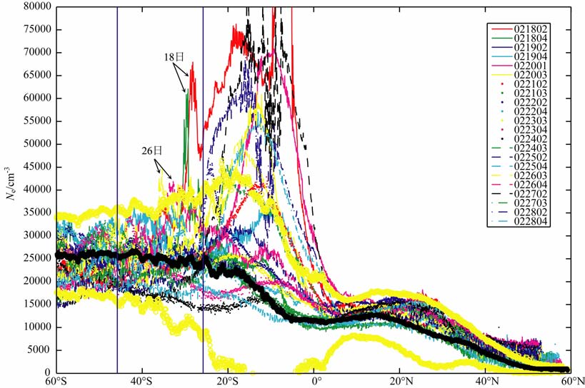 图 6 2月18〜28日各轨道电子浓度随纬度变化曲线图 Fig. 6 The graph of electron density changing with ktitude between Feb. 18th and Feb. 28th |