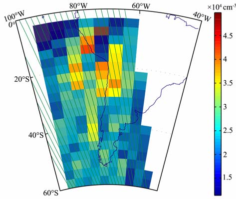 图 7 2月1〜14日电子浓度(Ne)背景场图中绿线为卫星飞行轨道. Fig. 7 Electron density background between Feb. 1st and Feb. 14th The green lines are the satellite orbits. |