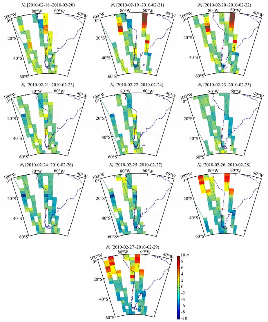 3.4 空间差值图将纬向(-60°~0°)、经向(260°~320°)按3°×5°的格子进行划分,以2月1日~2月17日震前数据为基础(去除Dst低于-30、Kp大于或等于4的2月2日、2月15、16、17 日轨道数据),计算每个格子中的中值作为背景场(如图 7 所示).每日观测数据也按划分好的格子求中值,与背景值相减并除以背景场中每个格子的标准差,按2天窗长、1天步长进行滑动显示(如图 8所示).
