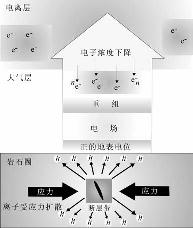 (3) 依据现有研究成果,有的学者发现震前电离层电子浓度降低[26],也有的学者发现震前电离层电子浓度升高[7].岩石介质从某种程度上说具有半导体特性,影响介质导电能力的主要因素是内部结构缺陷和杂质,如果内部杂质是周期表中第III族中的元素,则称为P 型半导体,在这样的材料中传导主要是由带正电的空穴引起的.如果杂质是周期表中第V 族中的元素,则称为N 型半导体,传导性是由于有多余的负离子引起的.Takeuchi等[27]的研究表明,地震孕育过程中由于岩石应力积累,如果地震断层带的岩石为P 型半导体,则在地表形成一组带正电的空穴(如图 9所示),在地表的正电位会吸引电离层中电子下沉,与大气中的中性粒子或者正离子复合,从而使震中上空附近电离层电子浓度降低.而如果是N 型半导体,则刚好相反,在地表聚集电子,使大气中带负电的电子向上运动,从而使震中上空附近电离层电子浓度增加.正因为地震孕育区的岩石介质的搀杂特性不同,所以震前电离层中存在正异常也存在负异常,并且这种异常在E×B的作用下还会向东或向西漂移,这就是为什么本研究轨道未完全经过震中上空,但也发现了24日电子浓度降低、26日电子浓度升高的现象.此外,电离层底部电子浓度较稀薄,垂直电场引起的扰动较小,而当这个扰动电场沿磁力线向上(磁赤道方向)传播到电子浓度较大的地方时,引起的扰动也会相应变大,从而被卫星观测到,图 8 2月20日的电子浓度异常不仅向东偏移,并且有向磁赤道方向偏移的现象.综上所述,针对不同地区的地震、同一地震的不同时刻,震前电离层电子浓度可能出现正异常也可能出现负异常,并且这种异常会向东西两侧及磁赤道方向偏移.