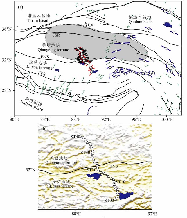青藏高原是印度板块和欧亚板块约45 Ma以来持续碰撞、汇聚的产物[1~2].大量的地学研究[3~10]发现,青藏高原广泛发育壳内低速层和部分熔融体,并认为壳内软弱层可能构成了高原物质逃逸的通道,Royden等[11]利用数值方法成功模拟了“地壳流"模型.然而,Wang 等[12]通过GPS 和SKS 数据分析认为,在高原地区地壳和岩石圈是耦合变形的,不存在壳内解耦层,壳内部分熔融并非普遍存在.区域层析成像和面波研究显示,以班公- 怒江缝合带(BNS)为界,藏南和藏北的岩石圈结构和属性存在较大的差异,如缝合带以南的拉萨块体下方上地幔中存在地震波高速、低衰减异常体[13~18],而缝合带以北的羌塘块体上地幔主要为低速异常[19, 20],且地震波具有高衰减和强各向异性特征(图 1)[21, 22].这反映了拉萨和羌塘两块体对于印度-欧亚板块汇聚的响应差异,但对于产生这种差异的成因及其对地壳介质属性和变形过程的影响仍存在很大的争议.地壳和地幔的变形机制是判别和分析以上问题的重要证据,一直以来,人们对地幔变形进行了大量的研究,而对地壳变形的研究还主要局限于中、上地壳尺度,对地壳深部,特别是青藏高原的地壳形变特征还缺乏充分的了解.