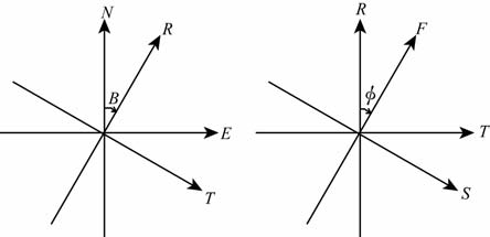 图 2 坐标系示意图 R、T、F、S分别表示径向轴、切向轴、快波轴和慢波轴,B表示台站反方位角,$\phi $是径向轴与快波轴的夹角. Fig. 2 Coordinate system used in this study R and T represent the radial and transverse direction. F and S denote the fastand slow polarization direction. B is the back azimuth of station, and $\varphi $ is the angle between the radial and fast polarization direction. |