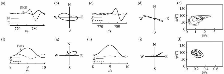 图 3 SKS和Pms偏振分析示例 (a)、(b)原始SKS震相在Z-R-T坐标系中的波形和质点运动轨迹;(c)、(d)经过校正后,SKS震相在Z-R-T坐标系中的波形和质点运动轨 迹;(e)SKS震相的切向能量等值线;(f)、(g)原始Pms震相在Z-R-T坐标系中的波形和质点运动轨迹;(h)、(i)经过校正后,Pms震相在Z-R-T坐标系中的波形和质点运动轨迹;(j)Pms震相的切向能量等值线. Fig. 3 Samples of SKS and Pms polarization analysis (a)〜(b) Seismic waveform and particlemotion of original SKS phase under Z^-T coordination; (c)〜(d) Seismic waveform and particle motion of SKS phase under Z~R~T coordination after seismic anisotropic correction; (e) Corrected tangential energy contour map of SKS phase; (f)〜(g) Seismic waveform and particlemotion of original Pms phase under Z-R-T coordination; (h)〜(i) Seismic waveform and particle motion of Pms phase under Z-R-T coordination after seismic anisotropic correction;j) Corrected tangential energy contour map of Pms phase. |