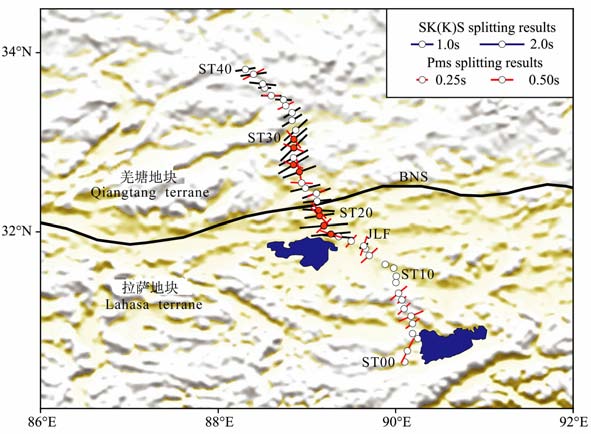 2 资料来源及处理方法1998~1999年在青藏高原实施的INDEPTH-III计划,横跨班公- 怒江缝合带,呈NNW 向由拉萨块体中部延伸到羌塘块体中部,剖面长约400km, 共记录500多个远震事件.本研究利用了41个(ST00-ST40)宽频带地震台(图 1)的远震资料.选取震中距30°~90°,震级大于5.5 级的远震P 波波形提取接收函数,为了压制高频噪声的影响,提取接收函数时对数据进行了频率为0.03~0.8Hz的带通滤波,挑选具有清晰P 波初至和高信噪比的接收函数进行Pms震相偏振特征分析;选取震中距85°~130°,震级大于6 级,SKS 明显的波形资料进行SKS 震相偏振特征分析.在这个震中距范围内的Pms(SKS)波是近似垂直入射的.在各向同性介质中,S波在穿过壳幔边界(核幔边界)时,S波是径向偏振的,只有径向分量(SV 波),没有切向分量(SH 波).如果地壳(地幔)存在各向异性层,则Pms(SKS)波穿过地壳(地幔)时会分裂成一对偏振方向正交的快、慢波,质点运动由原来的线性偏振变为椭圆偏振.一般用参数对(Φ,δt)描述Pms(SKS)波分裂,其中Φ 表示快波偏振方向与北向的夹角(单位:弧度);δt表示快、慢波的到时差(单位:s).